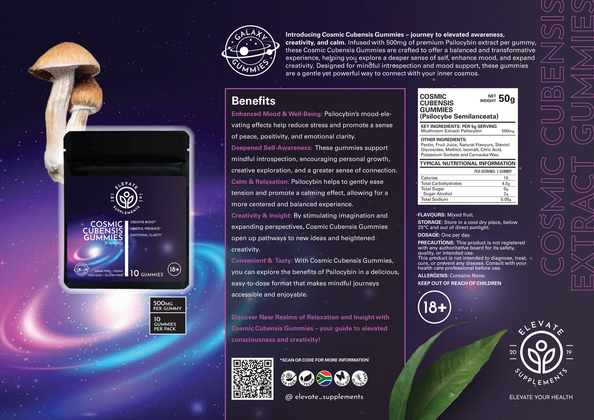 - Convenient & Tasty: With Cosmic Cubensis Gummies, you can explore the benefits of Psilocybin in a delicious, easy-to-dose format that makes mindful journeys accessible and enjoyable.