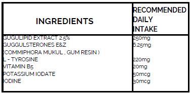 Ingredients: Gugulipid Extract, L-Tyrosine, VITB5, Iodine